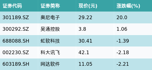 配资门户网该基金近五个交易日净值(复权单位净值,下同)上涨0.07%,近一个月净值下跌4.7%。该基金自(20210618)成立以来净值增长率为-42.45%,管理人为招商基金管理有限公司,基金经理为苏燕青。截至收盘,虚拟数字人主题涨跌幅最高的五只股票为:奥尼电子(301189.SZ)、吴通控股(300292.SZ)、虹软科技(688088.SH)、科大讯飞(002230.SZ)与网达软件(603189.SH)。详情见下表: